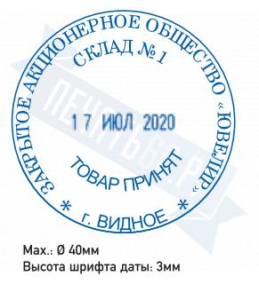 Ø 40 мм, высота даты: 3 мм. Со встроенной окрашенной штемпельной подушкой синего цвета.